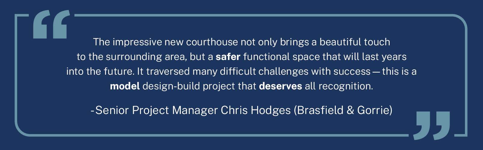 The courthouse illustrates a design-build project done right. The design-build team was led by Brasfield and Gorrie, and the entire team, including the owner, owner representatives, end-user, contractor, subcontractor and suppliers, made this project happen with collaboration and problem-solving—serving the single purpose of providing the end user with a building that meets their needs for many years to come
